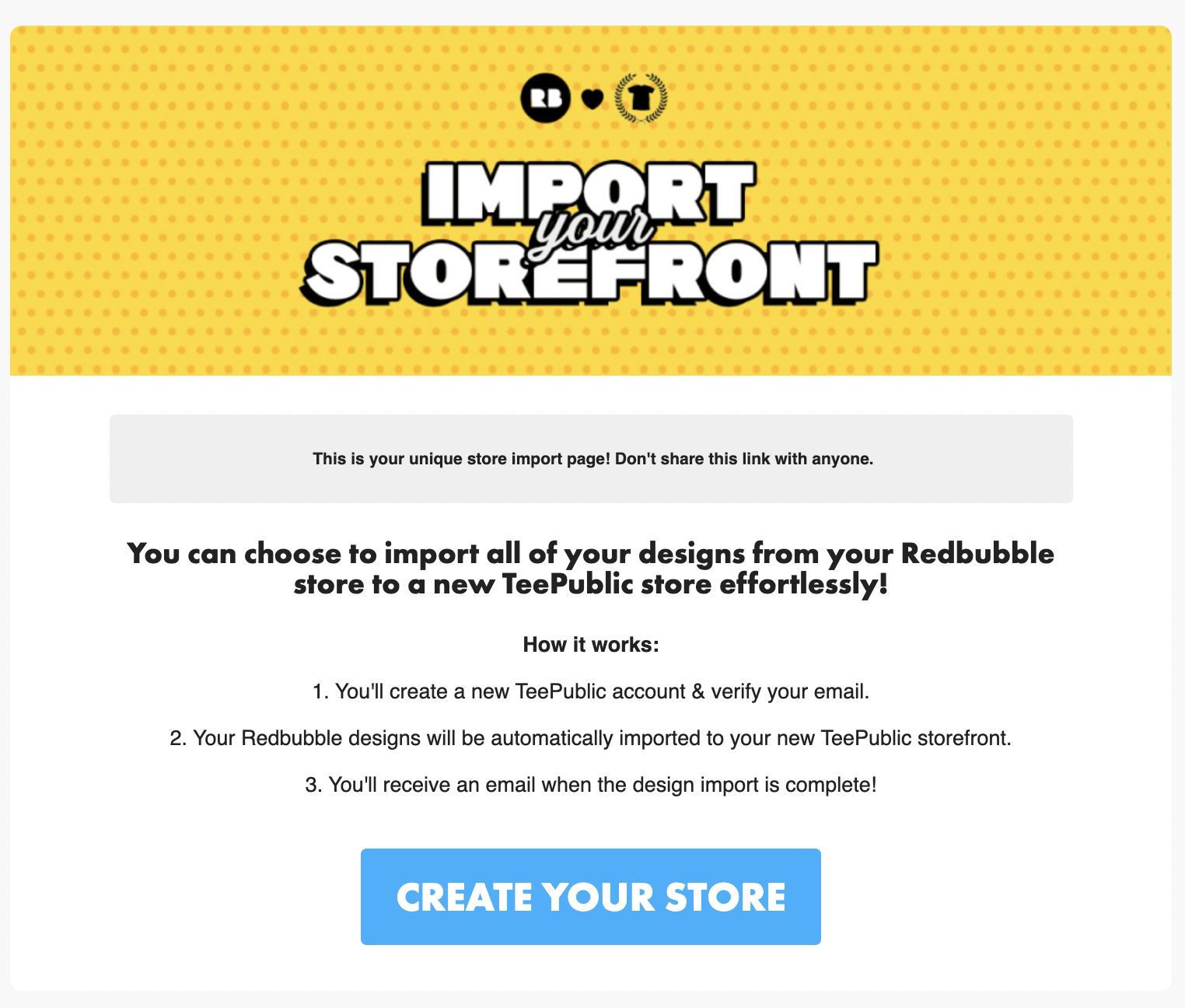- You'll land on the "Import Your Storefront" page with a custom URL just for you! Heads up, once you navigate to the TeePublic site, the only language supported is English.