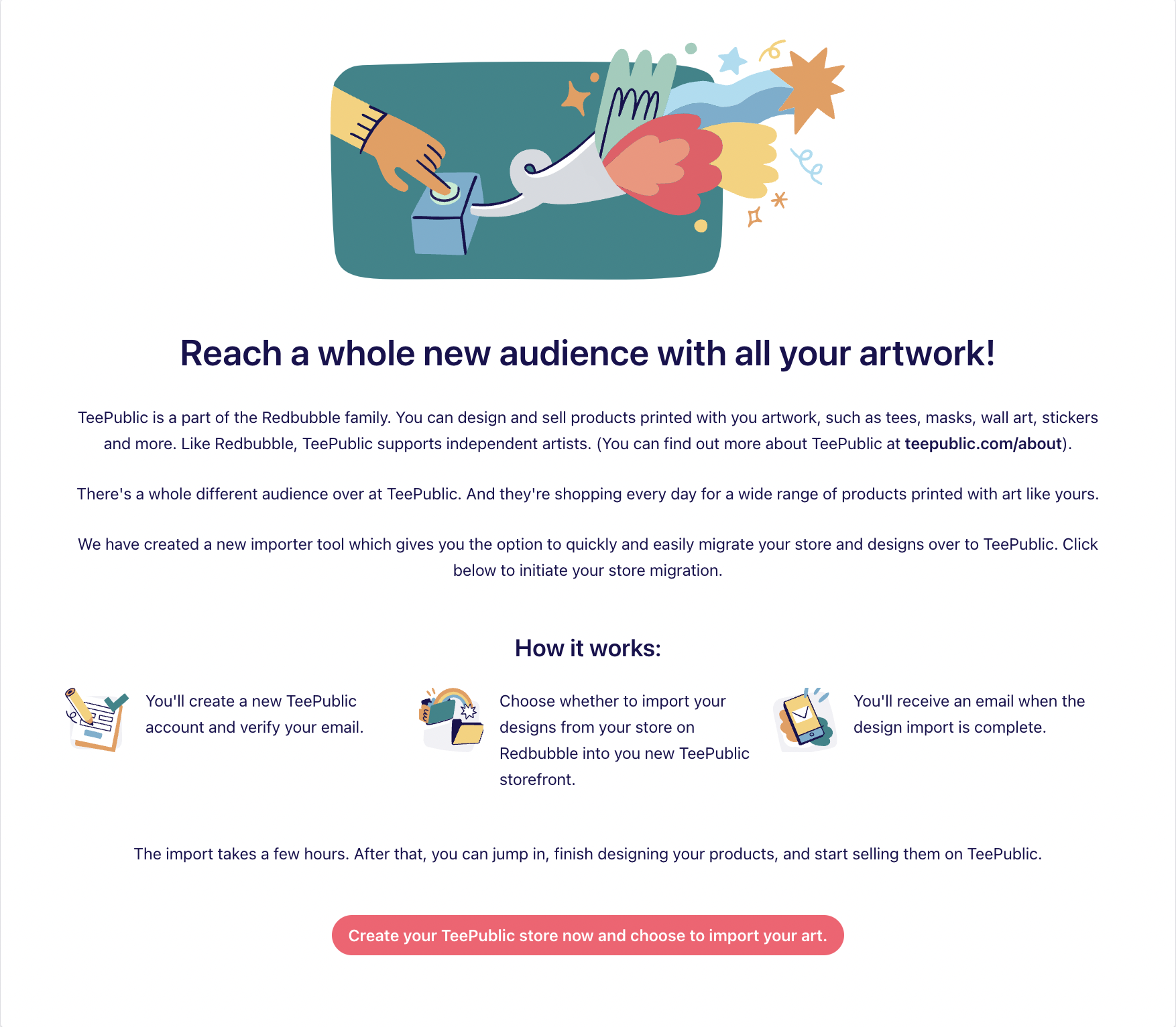 - Import your Redbubble designs to your new TeePublic storefront.