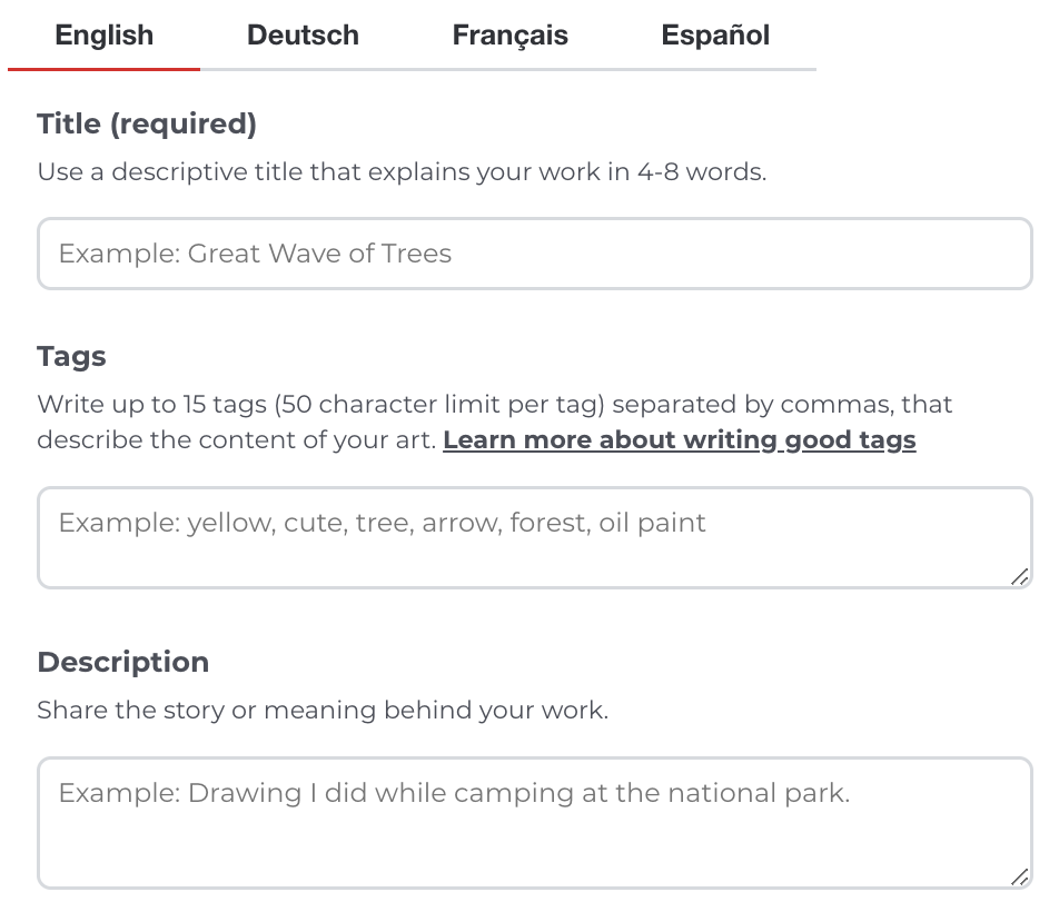 You can use up to 15 tags, with 50 characters each, that accurately describe your work. Brainstorm 30 words or phrases that define your creation and then narrow that down to the best 15. For example, if “pride” is an important tag defining your work, that should be one of the 15.